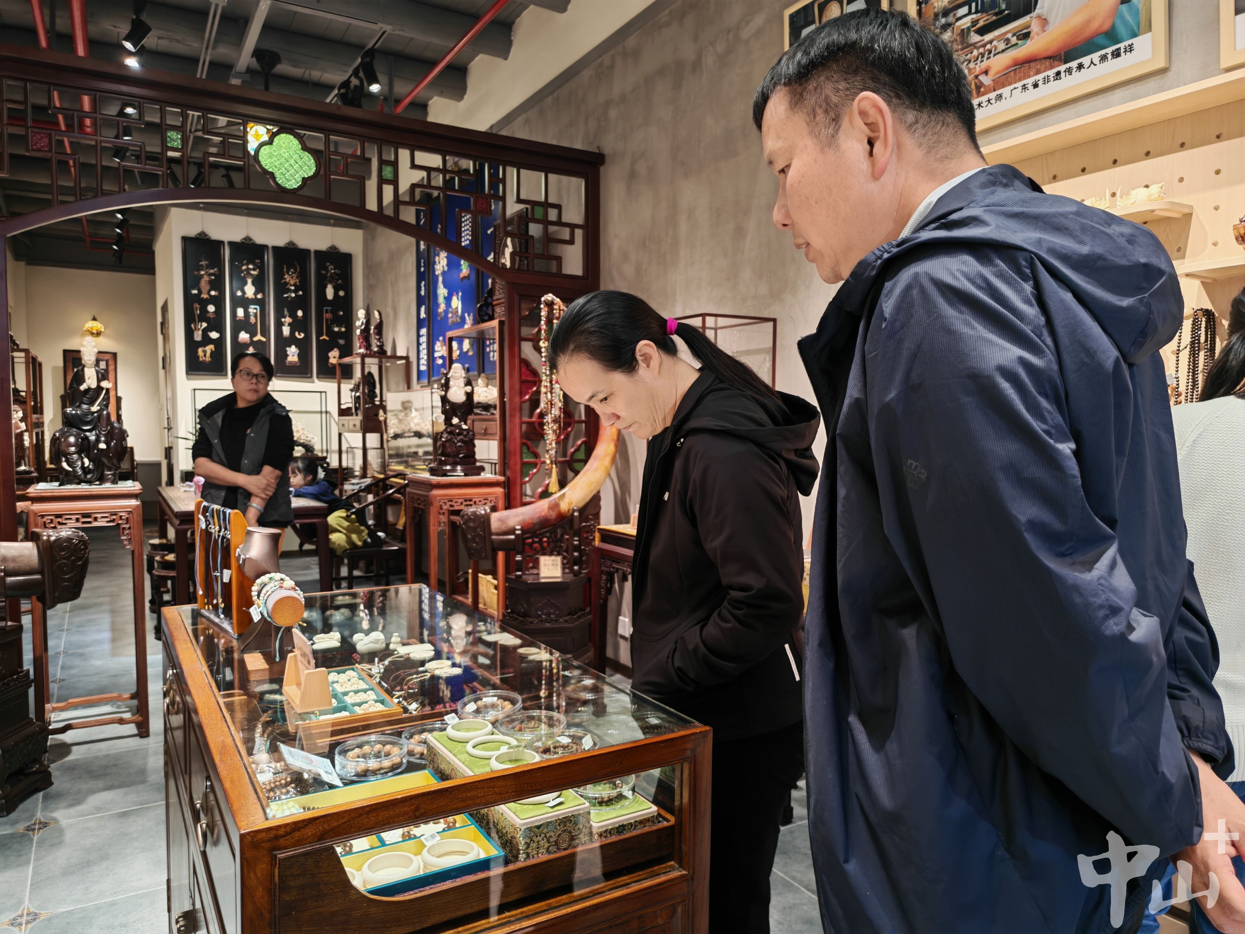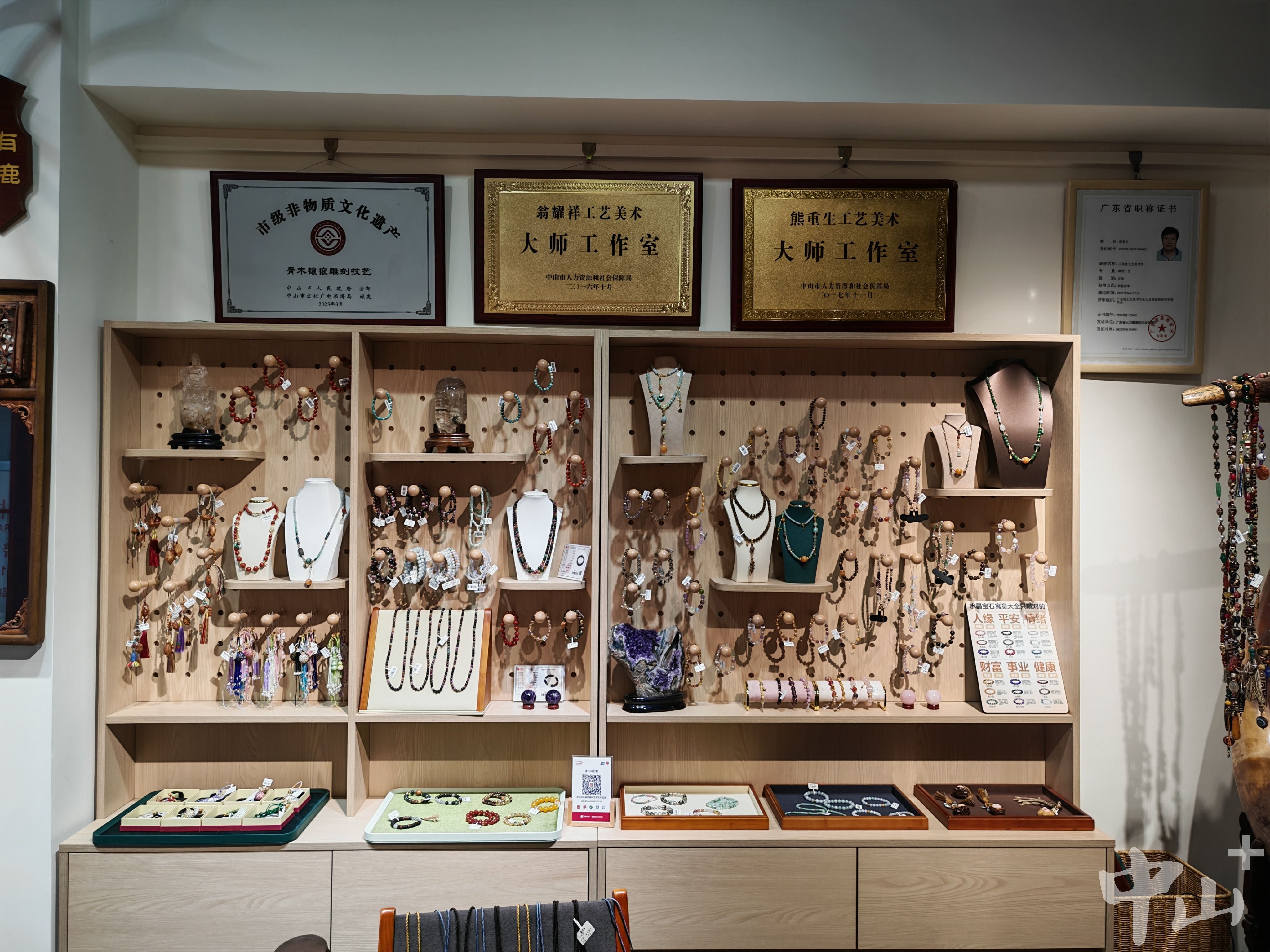 為打破非遺“曲高和寡”的困境,店鋪還推出猛犸牙配飾、文玩手串、文創(chuàng)掛飾等產(chǎn)品,將非遺技藝轉(zhuǎn)化為大眾可消費、可佩戴的日常好物。除了產(chǎn)品售賣,店鋪還依托“熊重生工藝美術(shù)大師工作室”“翁耀祥工藝美術(shù)大師工作室”,不定期舉辦大師講座、技藝展示等活動,形成“展示+體驗+傳承”全鏈條。負(fù)責(zé)人熊一磊介紹,小店剛開業(yè)2周,就已經(jīng)吸引了不少香港、澳門、深圳以及北京、上海等地的游客前來參觀選購,也讓不少本地市民近距離了解并熟悉了這項本土非遺技藝。