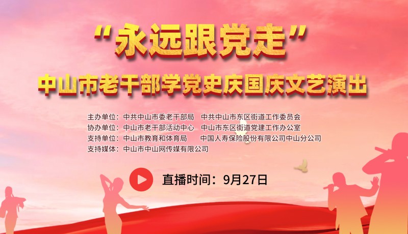 為深入學習貫徹習近平總書記“七一”重要講話精神,深化黨史學習教育成果,慶祝中華人民共和國成立72周年,展示新時代老干部的精神風貌。市委老干部局和東區(qū)街道黨工委聯(lián)合主辦的“永遠跟黨走”中山市老干部學黨史慶國慶文藝演出于9月27日舉行,中山網將全程直播,敬請關注。