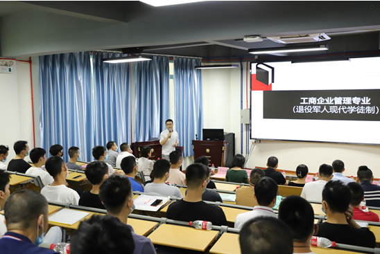 “狹路相逢勇者勝,在座的各位從繁忙的工作崗位上走出來,邁出繼續(xù)學(xué)習(xí)的關(guān)鍵一步,勇氣可嘉。三年后,相信大家一定會收獲知識、技能、學(xué)歷,更好地開啟新征程?!蓖艘圮娙爽F(xiàn)代學(xué)徒制項目開學(xué)典禮上,經(jīng)管學(xué)院院長肖紅在致辭中對新生們表示歡迎和祝賀,并表達了殷切期望,希望大家在求學(xué)期間,修德修身、克勤克儉、心懷理想,腳踏實地,融入多姿多彩的校園生活,在學(xué)生當(dāng)中彰顯軍人本色和榜樣力量。 市退役軍人事務(wù)局相關(guān)負責(zé)人對項目順利開班表示祝賀,對學(xué)院在項目申報、招生等工作中的辛勤付出表示衷心感謝。他介紹了項目實施的背景,指出開展退役軍人現(xiàn)代學(xué)徒制教育,是退役軍人安置工作的一項重要內(nèi)容,通過現(xiàn)代學(xué)徒制,讓大家成為全日制大學(xué)生,進行正規(guī)系統(tǒng)的高等職業(yè)教育,是黨和政府送給同學(xué)們的一份沉甸甸的“大禮包”。同時,要求新生們盡快適應(yīng)由士兵到大學(xué)生的角色轉(zhuǎn)變,勤學(xué)善思,掌握就業(yè)創(chuàng)業(yè)本領(lǐng),發(fā)揚軍隊能打勝仗的優(yōu)良傳統(tǒng),爭創(chuàng)佳績,為祖國和地方經(jīng)濟建設(shè)再立新功。 學(xué)院工商管理專業(yè)主任沈孟康介紹了學(xué)校和學(xué)院概況,就學(xué)生日常管理、教學(xué)內(nèi)容、方式和計劃等作詳細說明。表示學(xué)校將采取在崗培養(yǎng)與學(xué)校培養(yǎng)相結(jié)合,堅持“標準不降、模式多元、學(xué)制靈活”,線上與線下混合教學(xué),實行工學(xué)交替、靈活多元的教學(xué)模式。經(jīng)管學(xué)院已配備了教授、博士等“精銳”師資團,“量身定制”人才培養(yǎng)方案,全力保障“八一班”的教育教學(xué)質(zhì)量。