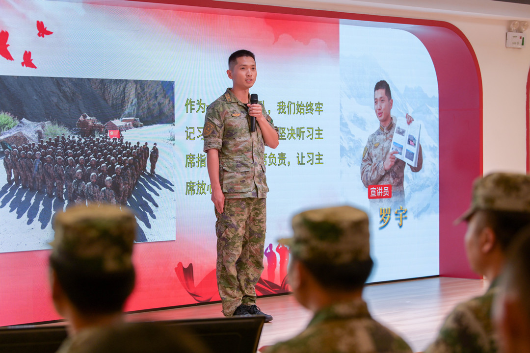 羅宇:爭(zhēng)做新時(shí)代最可愛的人 “新時(shí)代最可愛的人,就是任何時(shí)候、任何情況下都要堅(jiān)決聽黨話、永遠(yuǎn)跟黨走?!庇⒛挝淮砹_宇說。 羅宇動(dòng)情地講述—— 陳紅軍烈士在書中標(biāo)注:“黨把自己放在什么崗位上,就要在什么崗位上建功立業(yè)。” 陳祥榕烈士寫下戰(zhàn)斗口號(hào):“清澈的愛,只為中國(guó)?!?/p> 肖思遠(yuǎn)烈士在戰(zhàn)地日記中寫道:“我們就是祖國(guó)的界碑,腳下的每一寸土地,都是祖國(guó)的領(lǐng)土。” 還有許多戰(zhàn)斗在一線的勇士…… 在他們身上,我們看到強(qiáng)烈的愛國(guó)心、報(bào)國(guó)情。 郭開強(qiáng)分享軍旅故事。記者 易承樂 攝