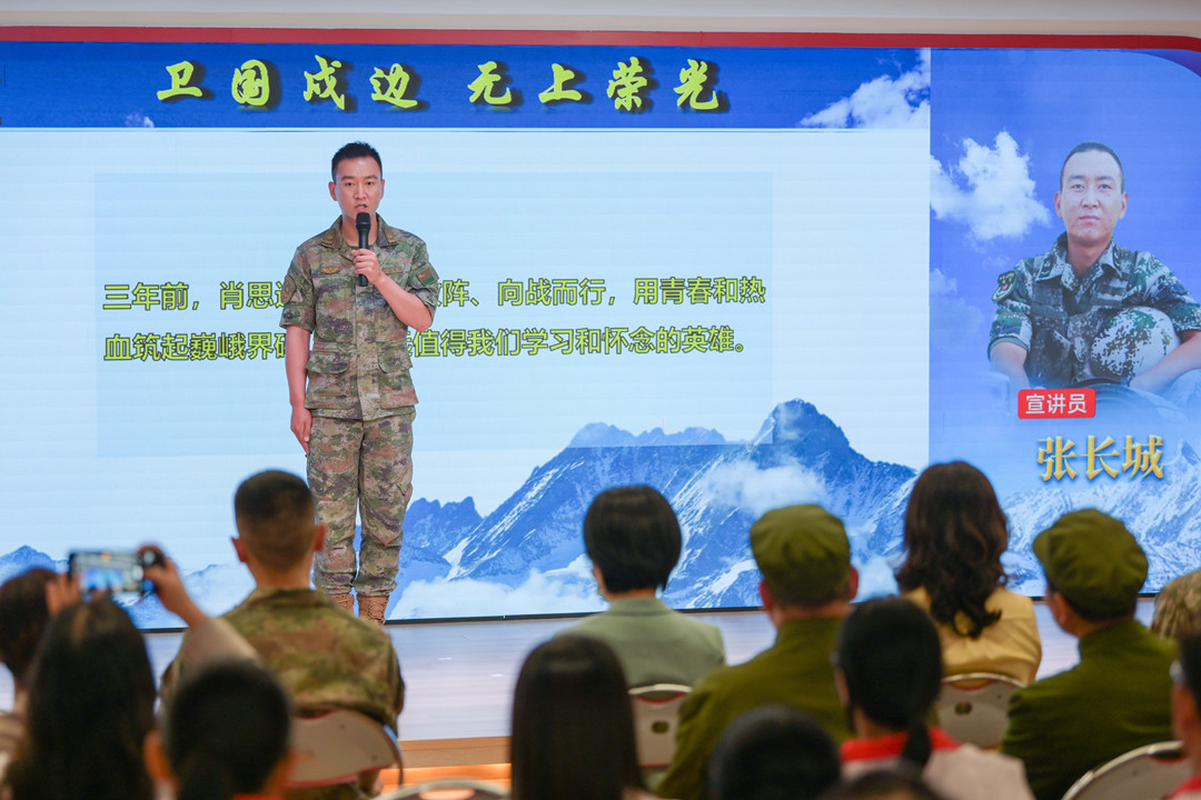 張長(zhǎng)城:肖思遠(yuǎn)的名字永遠(yuǎn)留在連隊(duì) “我是69316部隊(duì)加勒萬(wàn)邊防連‘肖思遠(yuǎn)班’班長(zhǎng)張長(zhǎng)城,很高興今天有機(jī)會(huì)跟大家進(jìn)行交流。三年前,肖思遠(yuǎn)班長(zhǎng)兩闖敵陣、向戰(zhàn)而行,用青春和熱血筑起巍峨界碑,是永遠(yuǎn)值得我們學(xué)習(xí)和懷念的英雄……” 張長(zhǎng)城現(xiàn)場(chǎng)作了主題為《衛(wèi)國(guó)戍邊 無(wú)上榮光》的宣講。 張長(zhǎng)城說—— 肖班長(zhǎng)犧牲后,連隊(duì)組建了“肖思遠(yuǎn)班”,班里有一張肖班長(zhǎng)的床,每天晚上,戰(zhàn)士們都會(huì)將肖班長(zhǎng)的被子打開,早上起床再將被子工工整整的疊好;晚上點(diǎn)名,班里的同志輪流向肖班長(zhǎng)匯報(bào)本班和個(gè)人的工作。 連隊(duì)每天的點(diǎn)名,呼點(diǎn)的第一個(gè)名字永遠(yuǎn)是“肖思遠(yuǎn)”,全連齊聲答“到、到、到”,那一刻,感覺下面所有人,望過去都是他! ▌與現(xiàn)場(chǎng)基層干部群眾互動(dòng)交流