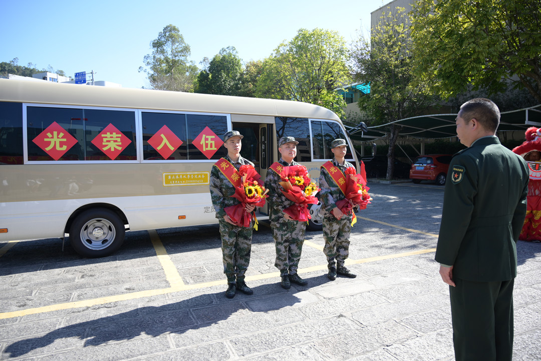 葉陽浩、胡家威兩名準(zhǔn)新兵身披“光榮入伍”的紅色綬帶和大紅花昂首挺胸站在太陽下,新兵家屬前來歡送?!瓣柡频奶檬迨?、外公和叔公都曾應(yīng)征入伍,他能進(jìn)部隊得到鍛煉,我們作為他的父母感到很光榮、很幸福。”葉陽浩的父母胸戴“光榮家屬”的大紅花,露出激動的笑容。