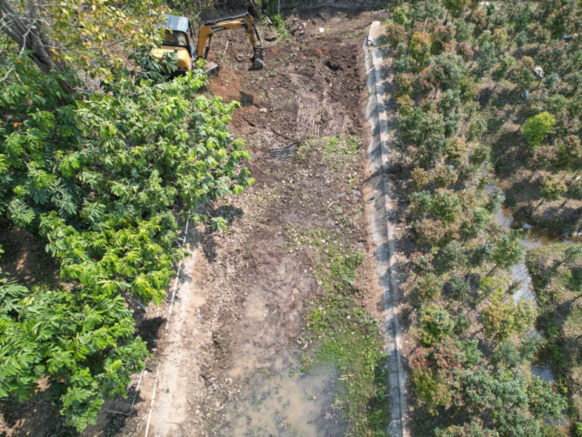 為提高清淤工作效率,結(jié)合木圍排灌渠兩側(cè)岸坡均已密植花木實(shí)際情況,本次活動采取了“挖機(jī)+人工”的清淤方式,由挖掘機(jī)將排灌渠內(nèi)雜草、淤泥集中清理堆至渠外空地,再由人工精細(xì)作業(yè),轉(zhuǎn)運(yùn)淤泥雜草至花木間區(qū)域平鋪晾曬改良土壤、增強(qiáng)肥力。