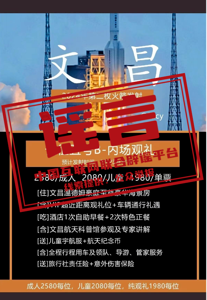 辟 謠 售賣(mài)“文昌航天發(fā)射場(chǎng)內(nèi)場(chǎng)火箭發(fā)射觀(guān)禮門(mén)票”系虛假宣傳
