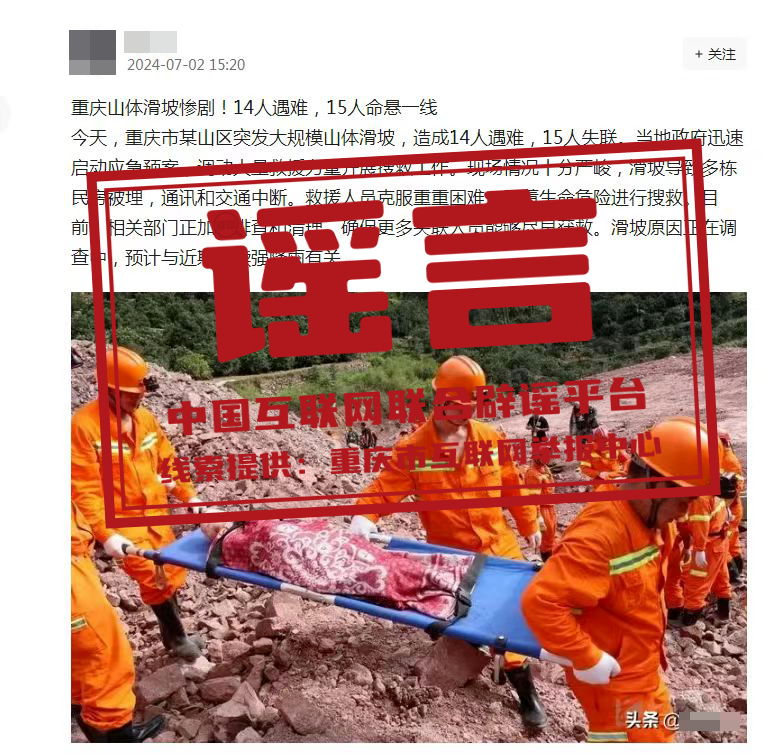 真相:7月2日,某網民發(fā)布信息稱,“重慶市某山區(qū)突發(fā)大規(guī)模山體滑坡,造成14人遇難,15人失聯(lián)?!苯浵嚓P部門核實,重慶近日未發(fā)生相關地質災害,網傳信息系謠言。(來源:重慶辟謠)