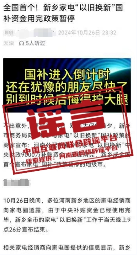 謠 言 河南新鄉(xiāng)家電“以舊換新”國家補貼資金用完、政策暫停?