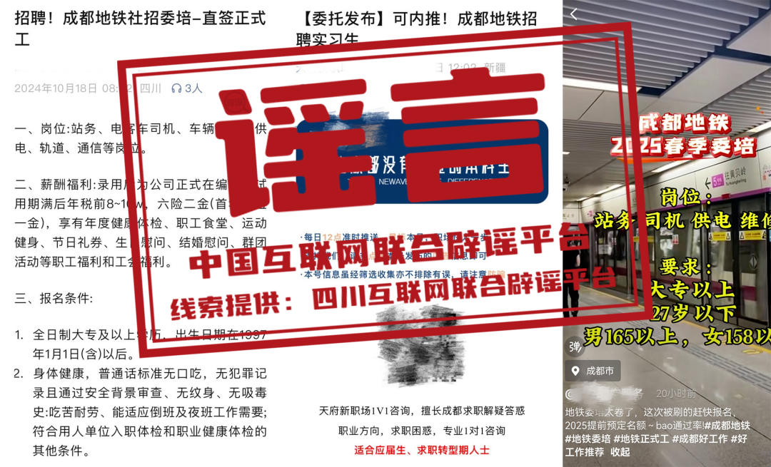 謠 言 成都地鐵招聘“提前預(yù)定名額”?濟南地鐵校園招聘有“真題”?