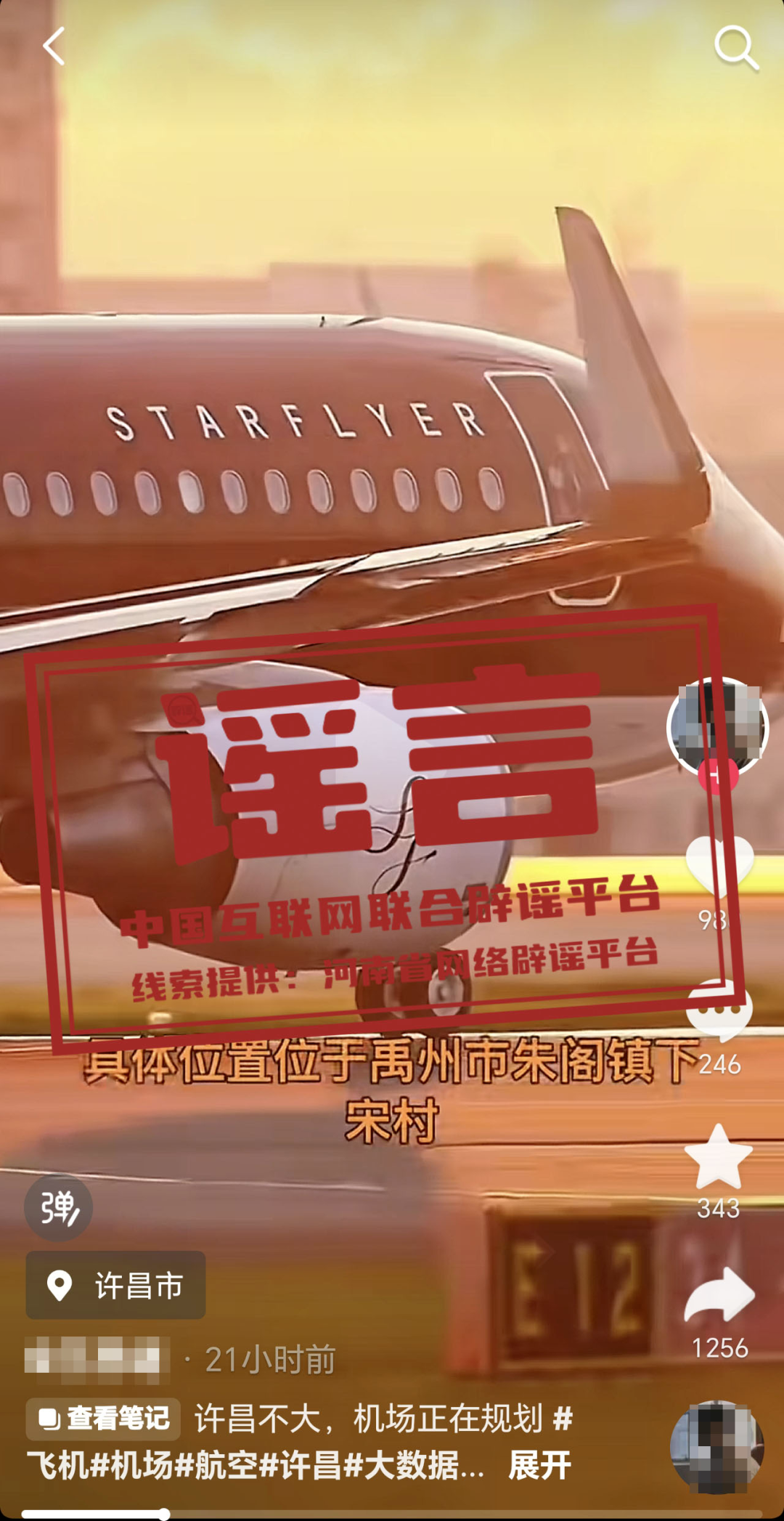 真相:近日,有網(wǎng)民在某平臺發(fā)布視頻稱:“未來河南許昌將建設(shè)禹州、襄城、鄢陵3個(gè)機(jī)場,其中禹州市的通用機(jī)場具體位置在朱閣鎮(zhèn)下宋村,項(xiàng)目總投資為10億元,計(jì)劃占地1000畝”等。經(jīng)向相關(guān)部門查證,三地的通用機(jī)場均處于前期謀劃階段,截至目前,暫未對選址地點(diǎn)、占地?cái)?shù)量及投資金額進(jìn)行具體規(guī)劃,視頻內(nèi)容為不實(shí)信息。(來源:“清朗河南”微信公眾號、網(wǎng)信許昌)