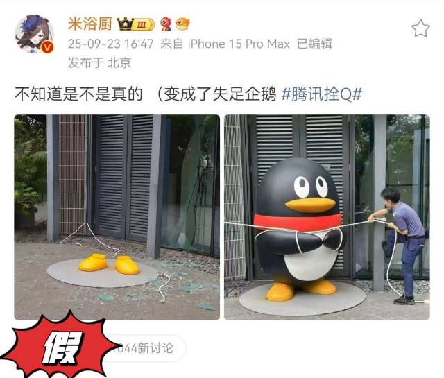 比如騰訊公司門口的企鵝雕塑,公司為了防御臺風,將企鵝用繩拴了起來。而有網(wǎng)民傳播的圖片顯示企鵝只剩雙腳,上身被風吹走。騰訊QQ回應:“鵝拴著呢,穩(wěn)穩(wěn)的?!?/p>