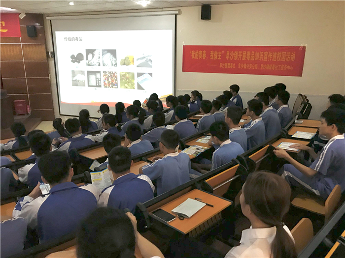 活動現(xiàn)場,鎮(zhèn)禁毒辦專干和禁毒社工通過派發(fā)宣傳單張、介紹仿真毒品模型、講解禁毒PPT、口號宣誓、有獎問答等方式向?qū)W生們普及禁毒防毒知識,力求從根源上打造無毒校園。