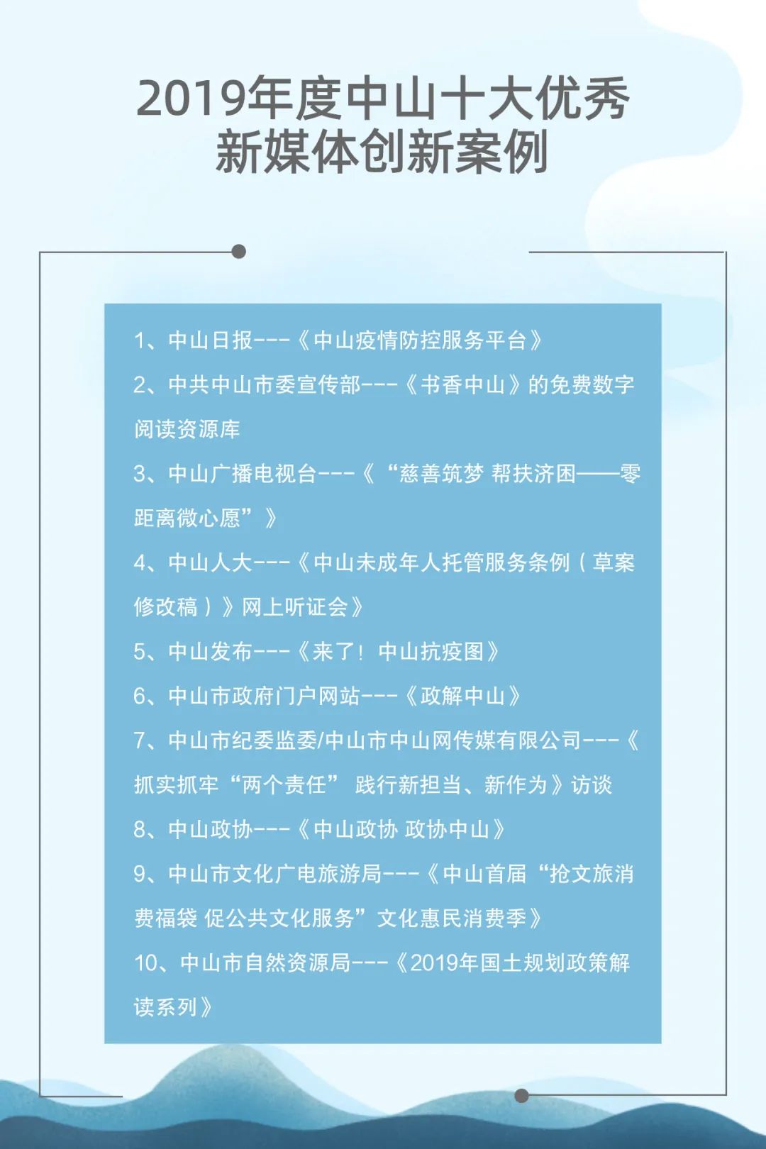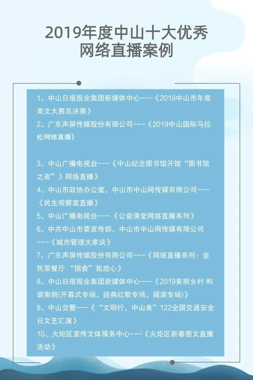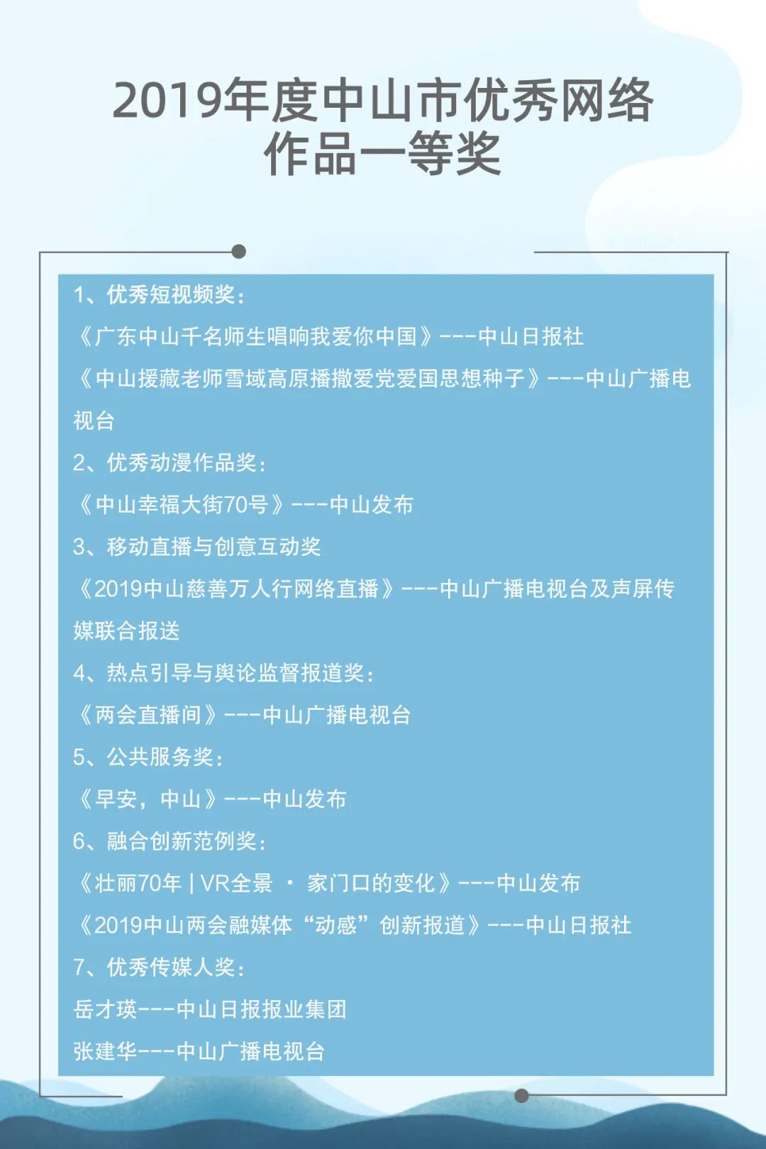 自2015年起,中山市網(wǎng)絡文化協(xié)會聯(lián)合中山日報報業(yè)集團、人民網(wǎng)輿情數(shù)據(jù)中心已連續(xù)成功舉辦了四屆中山新媒體影響力年度排行榜發(fā)布會。與此同時,自2017年起,中山廣播電視臺聯(lián)合新榜(上??窗裥畔⒖萍加邢薰荆┮惨呀?jīng)連續(xù)成功舉辦了三屆中山市新媒體頒獎盛典。兩個評選活動通過立標桿、樹典型,有效促進了中山新媒體的建設運營水平,推動了中山新媒體的健康向上發(fā)展。